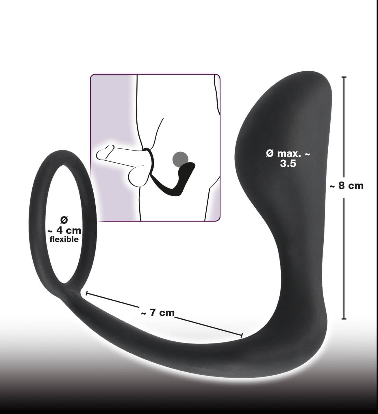 Nu numai că erecțiile pot fi mai mari și mai dure cu un inel pentru penis, dar și jocul anal va aduce mai multă plăcere! Flexibil, foarte pliabil, moale la atingere, fabricat din silicon de înaltă calitate, cu un dildo anal cu clip, pliabil. Parametrii : Lungimea plugului anal: 10cm. Lungimea plugului anal inserabil: aprox. 8cm. 7cm. Diametrul plugului anal: 1,1-3,5cm. Diametrul interior al inelului: 4cm (ușor flexibil). Grosimea peretelui inelului: aprox. 0,5 cm. SFAT: Inelul poate fi folosit și pe testicule. Material: Silicon (fără ftalați). culoare neagră. SFAT: Folosiți numai lubrifiant pe bază de apă cu produsul