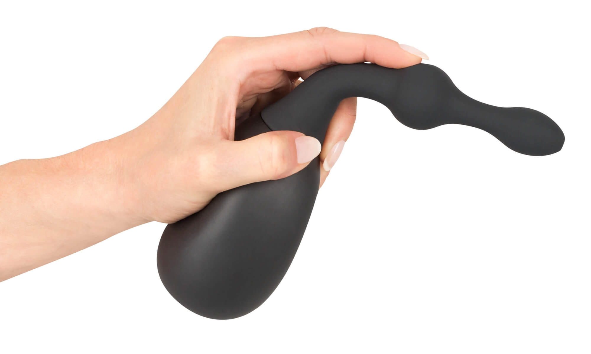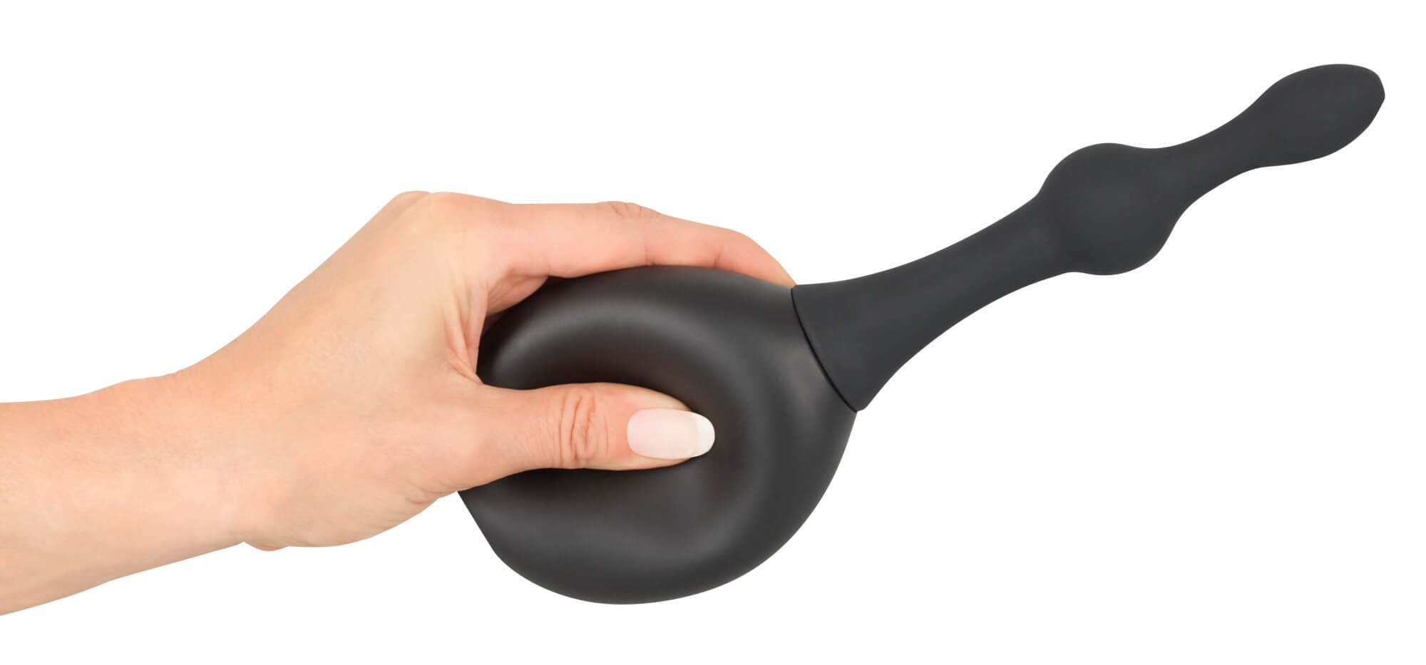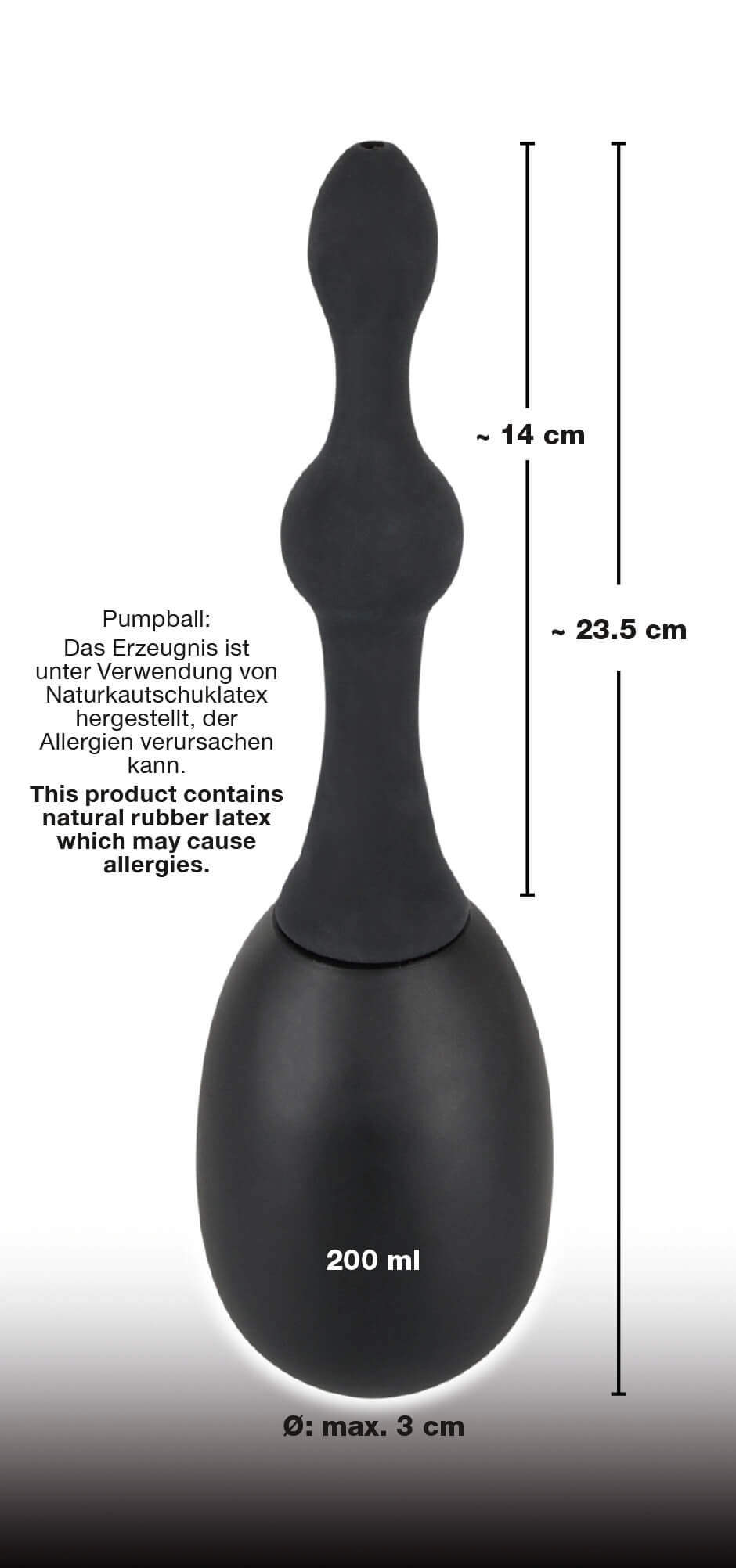 Canula este fabricată dintr-un material siliconic flexibil, moale la atingere și are o formă sferică, stimulativă. Ajutorul este echipat cu o bilă de cauciuc ușor de pompat. Caracteristici: -lungime totală: 23,5cm -lungime canulă: 14cm -diametru: 1,1-3cm -volum: 200ml -racord canulă filetat -construcție robustă cu suprafață moale -bolă ușor de împins -canulă foarte flexibilă Material. Culoare neagră. SFAT: pentru o penetrare mai ușoară se recomandă utilizarea dispozitivului cu un lubrifiant pe bază de apă. Pentru utilizare, umpleți bila cu apă călduță, apoi introduceți-o în anus și strângeți bila. Lichidul injectat trebuie menținut pentru scurt timp și apoi eliberat. Se recomandă repetarea acestui proces până când lichidul evacuat este complet transparent.