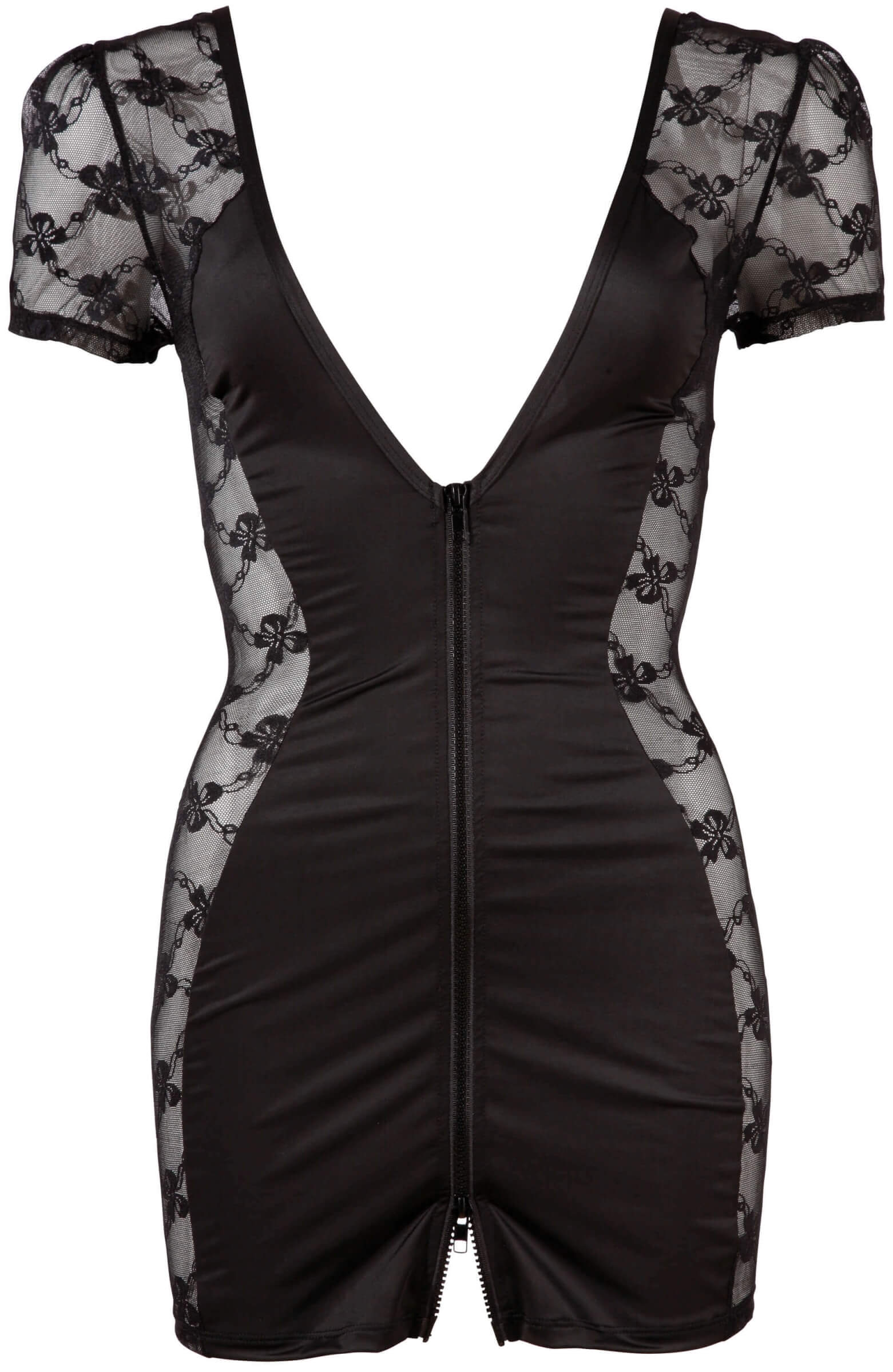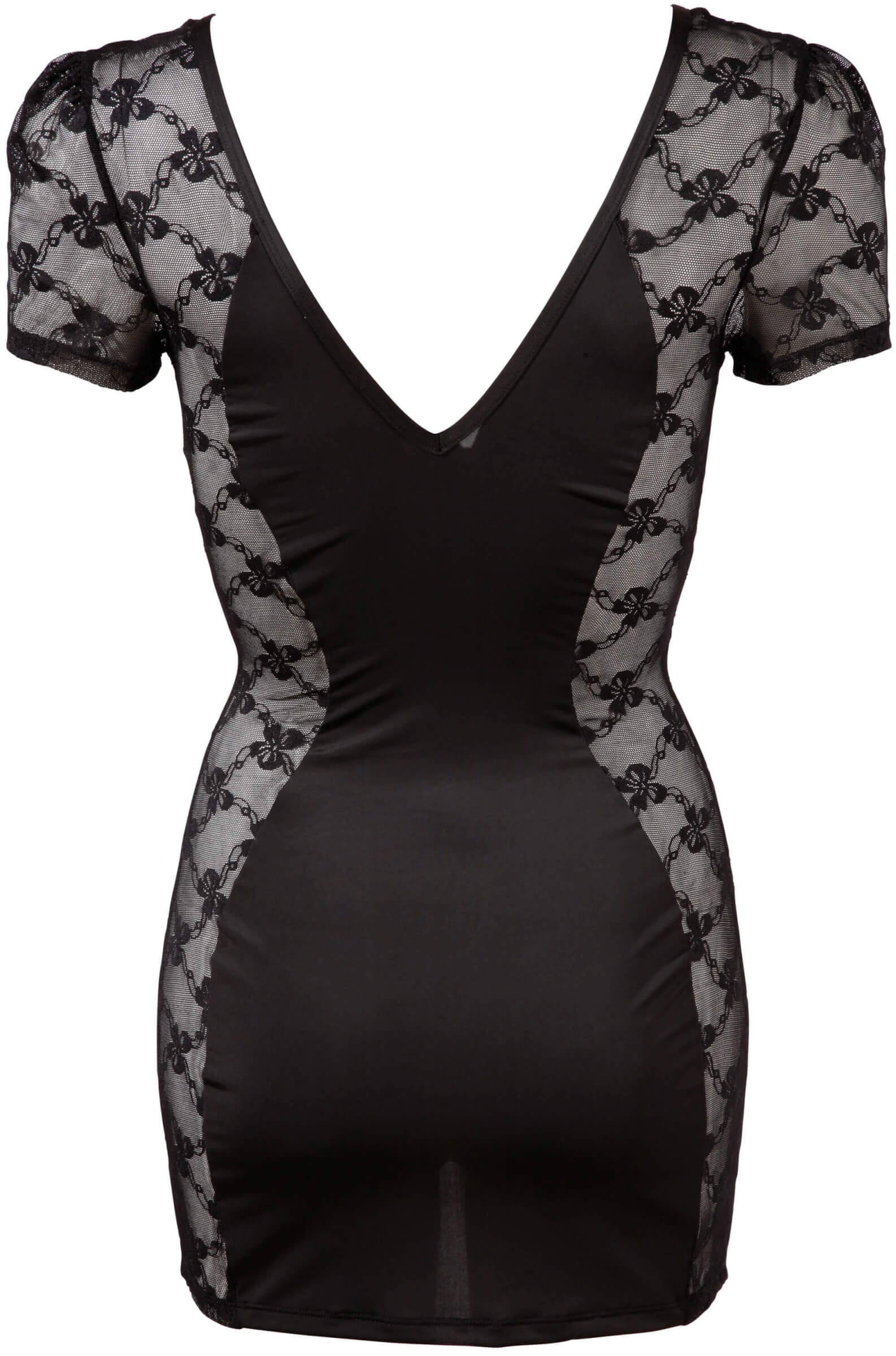 Rochie mini ultra sexy, senzuală, care este o armonie perfectă a materialului moale de culoare neagră, aproape transparentă și dantelă complet transparentă, decorată cu funde fermecatoare și fermecatoare. Este realizata cu maneci scurte, o croire slim care accentueaza silueta, cu insertii de dantela transparenta pe ambele fete. Decolteu în V foarte... Mai multe informații