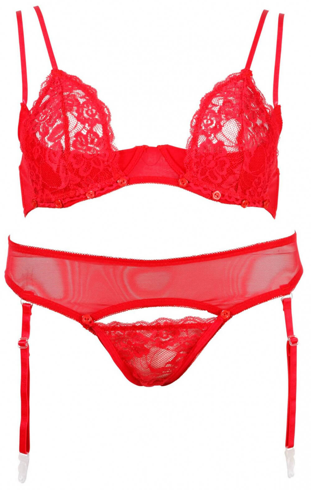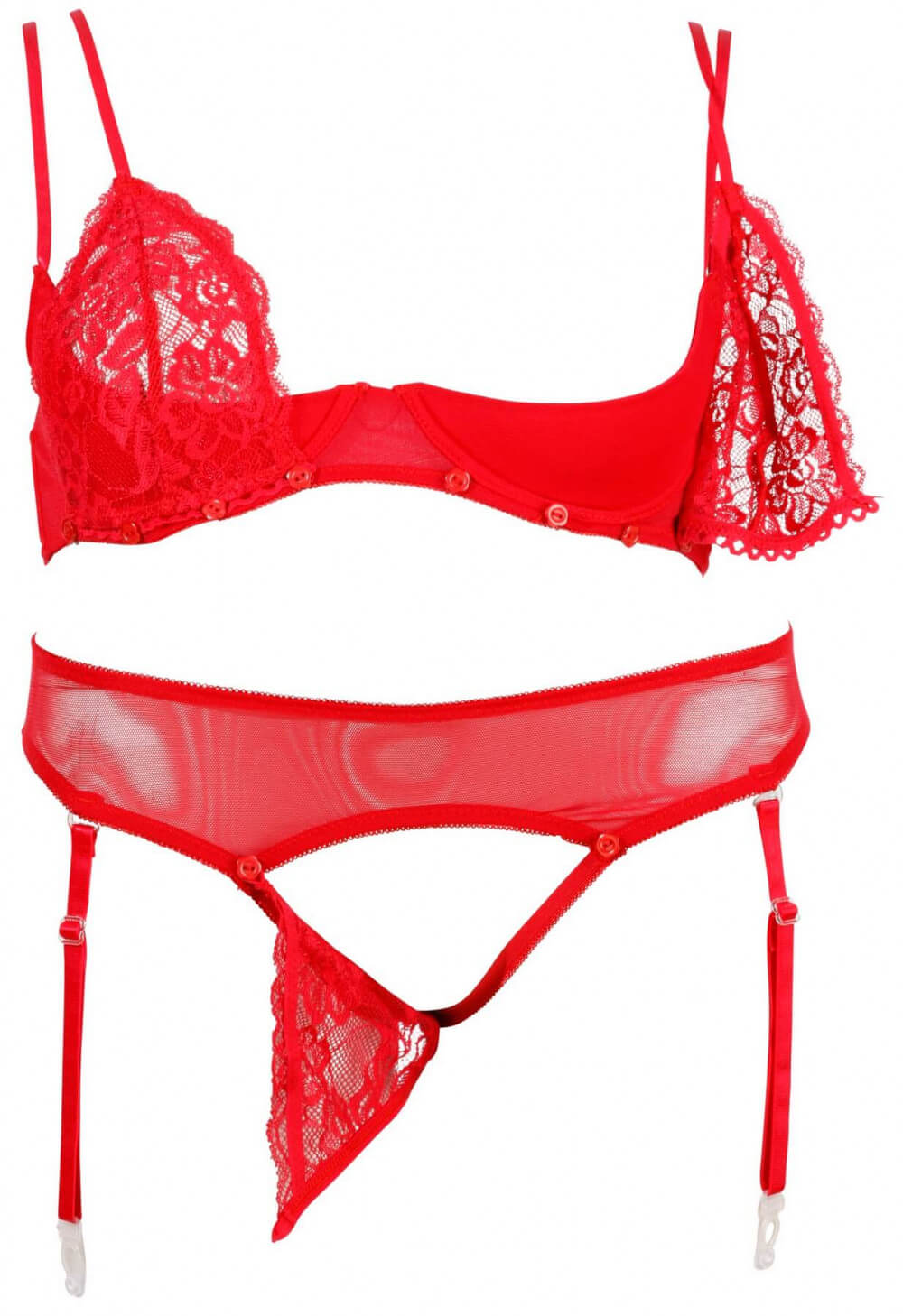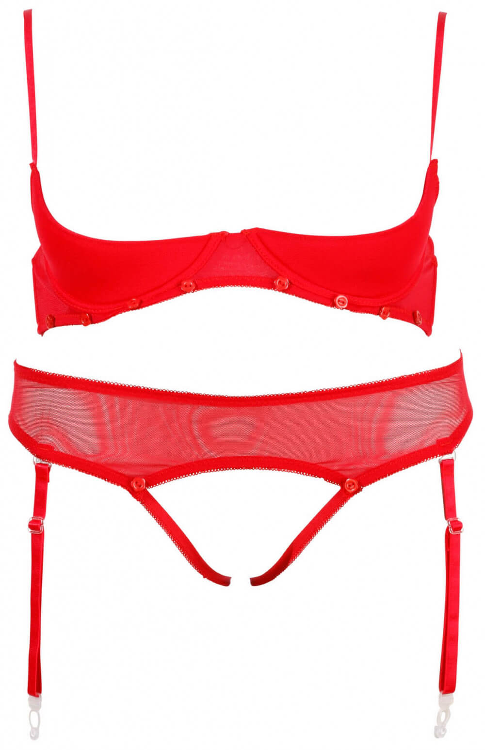 Sexy, sau chiar mai sexy. Decide pentru tine!Un set dublu multifuncțional realizat din material flexibil de înaltă calitate.Setul include:-sutien, sutien de ridicare într-unul- chiloți cu breteleMaterial: 90% poliamida, 10% elastan. În roșu. Ciorapii nu sunt incluși în pachet.