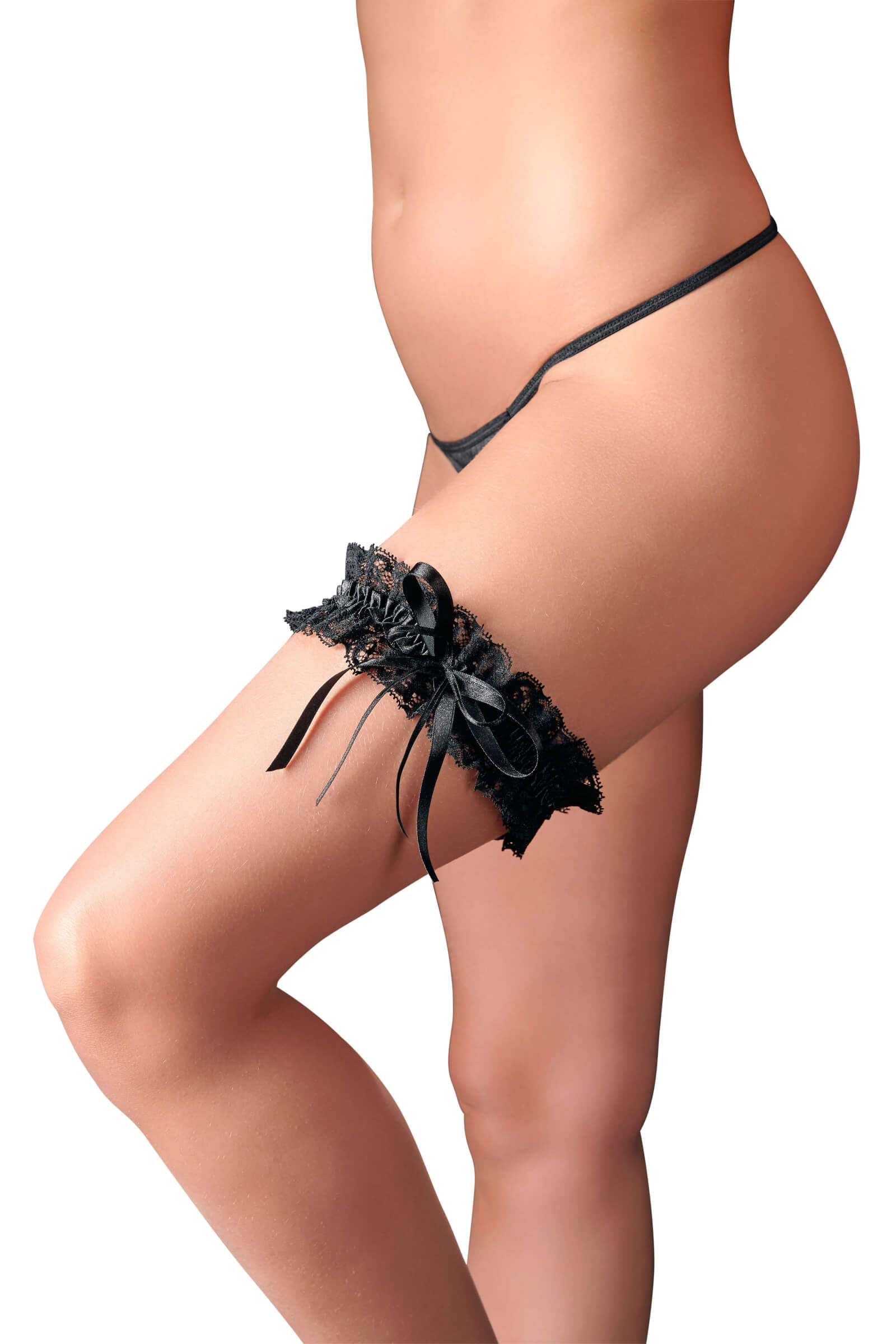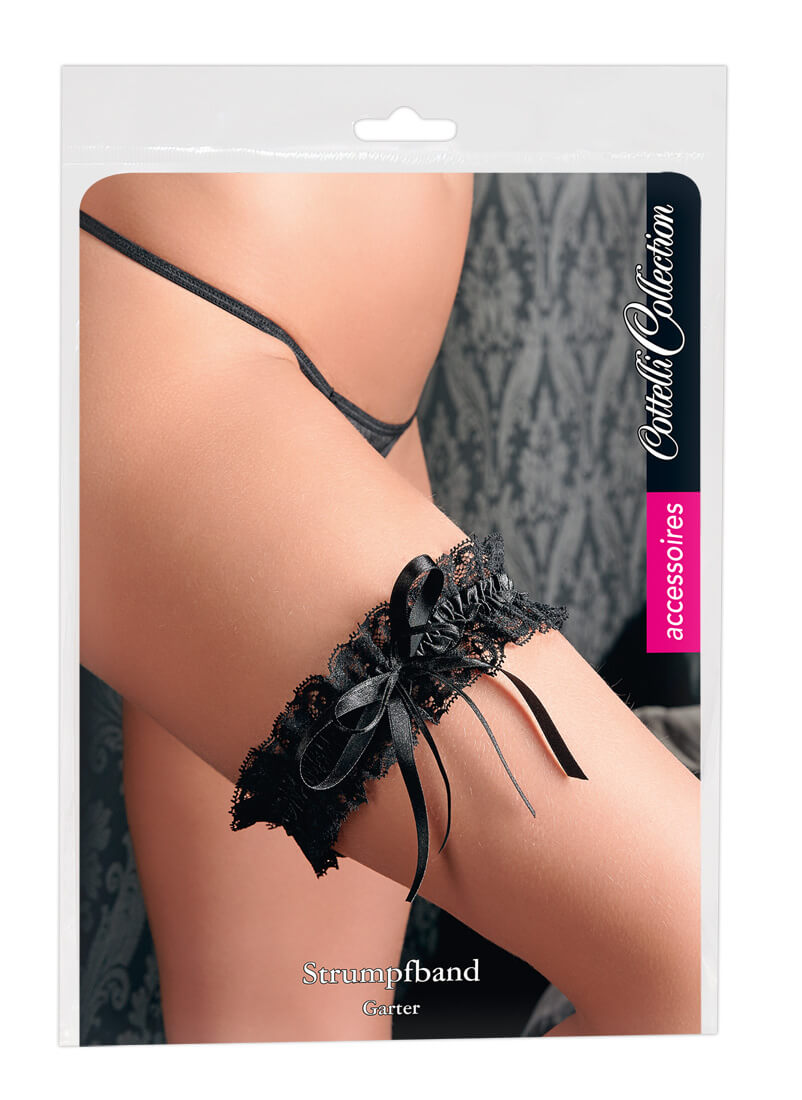 Jartieră din dantelă moale, elastică, cu volane, decorată în mijloc cu panglică neagră din satin. Mărime: S-L (uniformă). 90% poliester, 10% elastan.