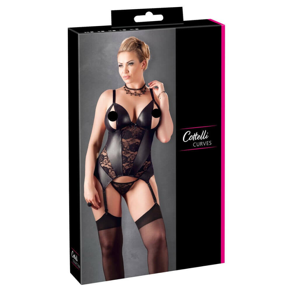 Atrăgătoare, elegantă și sexy! Topul de dama este in partea din fata din material stralucitor cu efect umed in combinatie cu dantela detaliata, iar in partea din spate din material transparent. Croiala varfului subtiaza silueta si nu acopera mameloanele. Bretelele pentru jartiere și bretelele de umăr sunt reglabile. Pachetul include si curele din dantela... Mai multe informații