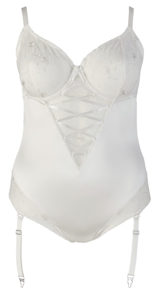 Corp cu sârmă modelată și bretele extra largi, precum și prindere cu cârlig la spate. Tulle brodat în față și în jurul chiloților. Cu brevete peste picioare. Bretelele de umăr și bretelele pentru jartiere sunt reglabile și detașabile.