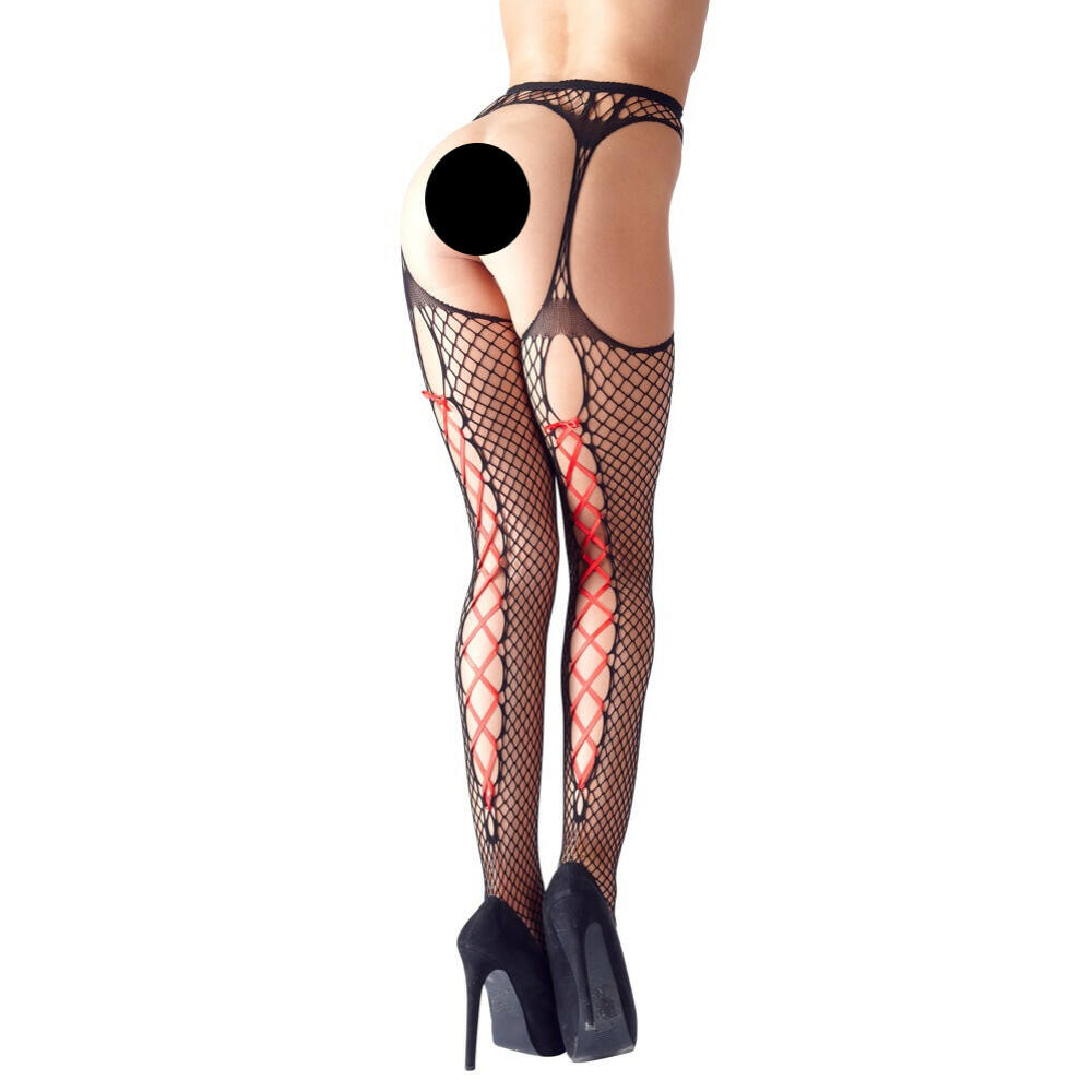 Ciorapi senzuali, neobișnuiți, rafinați legați de o jartieră cu balamale subțiri, pentru un aspect sofisticat al picioarelor! Realizat din plasă elastică, neagră, pe spate, cu șireturi din satin roșu atrăgător. Material: 90% poliamidă, 10% elastan. Culoare neagră.