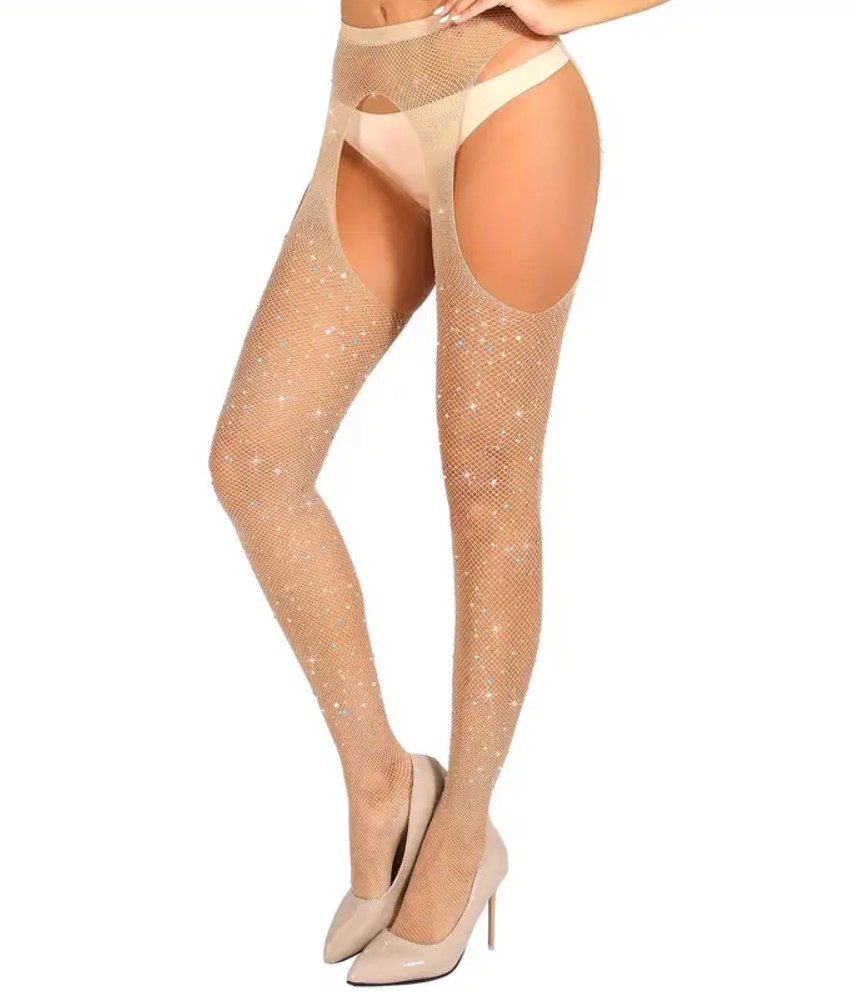 Colanți bej, din plasă, cu între picioare deschise și decupaje pe părțile laterale. Materialul din plasă moale, foarte elastic, cu adaos de elastan asigură un confort maxim la purtare și este acoperit cu cristale strălucitoare de diferite dimensiuni. Dresurile sexy, bej, cu decupaje incitante, arată foarte asemănător cu ciorapii și jartierele. Picioarele tale lungi acoperite cu "picături" strălucitoare vor atrage privirile. În plus, ciorapul se adaptează la orice mișcare (erotică), iar între picioare rămâne minunat de aerisit și invitător de deschis, ca și cum ar fi făcut pentru ciorapi de sex spontan pentru o lungă perioadă de timp . Material : poliester, elastan Culoare : Bej Mărime : S/M
