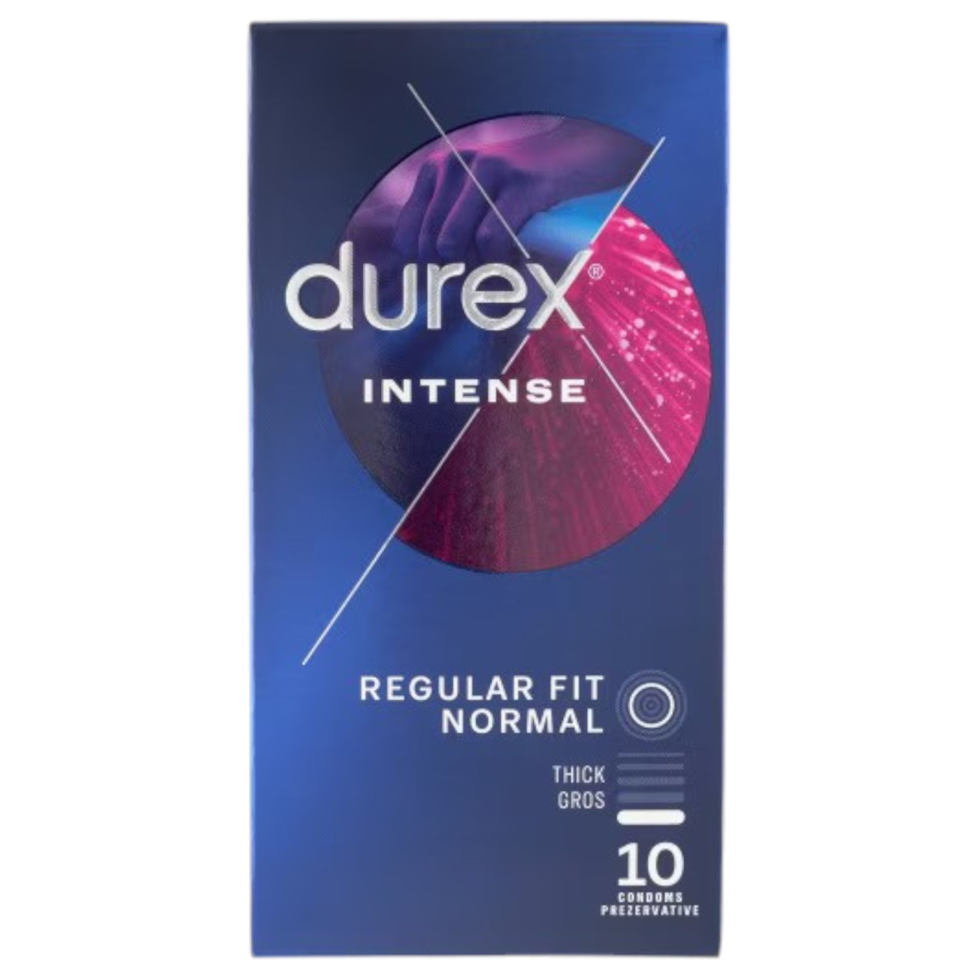 Prezervative Durex Intense de înaltă calitate, cu suprafață festonată și punctată, într-un pachet modern de 10 bucăți! Prezervative cu formă anatomică, realizate cu tehnologia "Easy on", care sunt extrem de ușor de pus. Suprafața exterioară a prezervativelor este festonată și punctată, ceea ce stimulează plăcut vaginul. Suprafața prezervativelor este, de asemenea, îmbogățită cu un gel stimulant care crește sensibilitatea părților intime feminine, ceea ce ajută și la atingerea orgasmului. Livrat într-un pachet de 10. Caracteristici : Material: cauciuc natural (latex). Lungime: 195mm. Diametru: 56mm. Avertisment: Din motive de igienă, bunurile nu pot fi returnate, chiar și în termen de 14 zile de la cumpărare. Prezervativul este de unică folosință. Nicio metodă contraceptivă nu vă poate oferi protecție 100% împotriva sarcinii, HIV sau a altor boli cu transmitere sexuală. A nu se lăsa la îndemâna copiilor. Prezervativele sunt un dispozitiv medical.