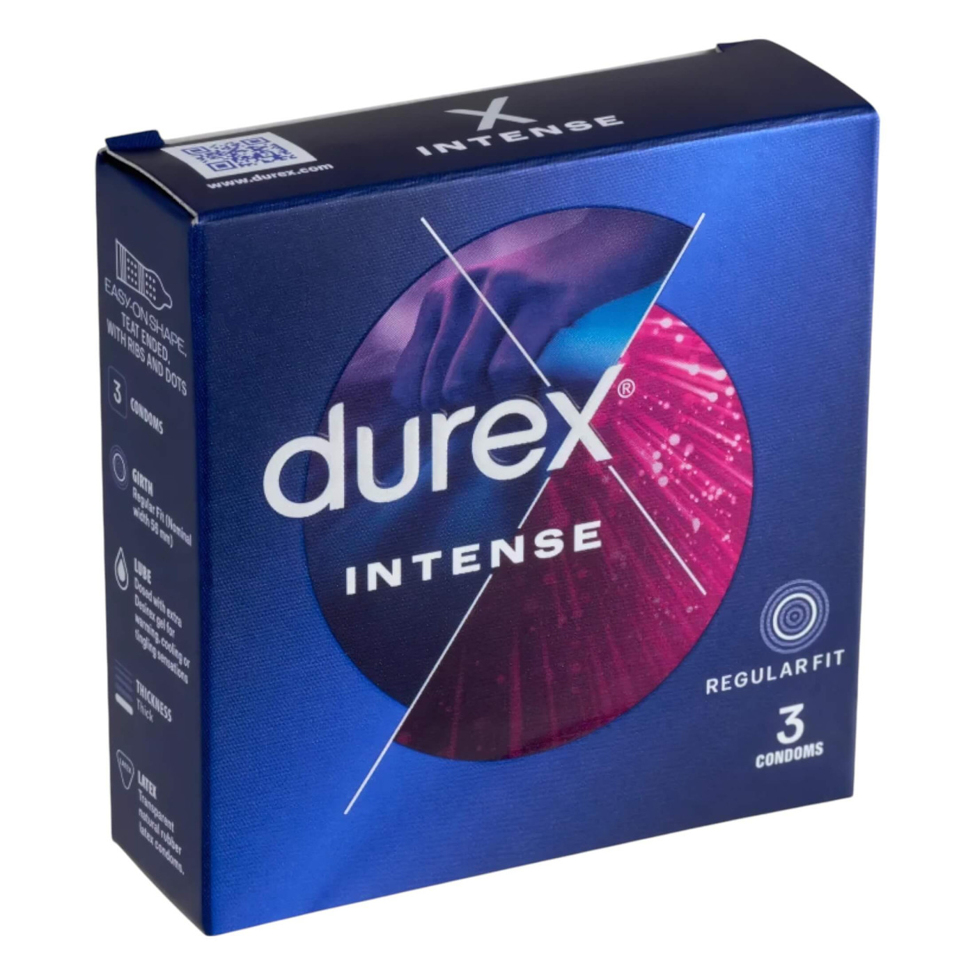 Prezervative Durex Intense de înaltă calitate, cu suprafață festonată și punctată, într-un pachet modern de 3! Prezervative cu formă anatomică, realizate cu tehnologia "Easy on", care sunt extrem de ușor de pus. Suprafața exterioară a prezervativelor este festonată și punctată, ceea ce stimulează plăcut vaginul. Suprafața prezervativelor este, de asemenea, îmbogățită cu un gel stimulant care crește sensibilitatea părților intime feminine, ceea ce ajută și la atingerea orgasmului. Se livrează într-un pachet de 3. Caracteristici : Material: cauciuc natural (latex). Lungime: 195mm Diametru: 56mm Grosime : 0.07mm Avertisment: Din motive de igienă, bunurile nu pot fi returnate, chiar și în termen de 14 zile de la cumpărare. Prezervativul este de unică folosință. Nicio metodă contraceptivă nu vă poate oferi protecție 100% împotriva sarcinii, HIV sau alte boli cu transmitere sexuală. A nu se lăsa la îndemâna copiilor. Prezervativele sunt un dispozitiv medical.