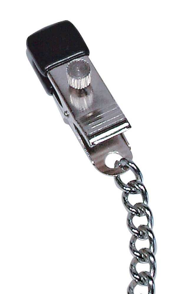 Lanț impresionant cu cleme pentru mameloane! Dacă îți place plăcerea extremă și durerea tandră, atunci acest lanț metalic pentru sfârcuri nu poate lipsi din colecția ta. Ciupituri speciale, cauciucate, cu forță de presiune reglabilă. Lungimea fiecărei înțepături aprox. 5,5 cm, lățime 1,5 cm. Greutatea lanțului aprox. 70 g. Material: metal (fără alergeni). Mai multe informații
