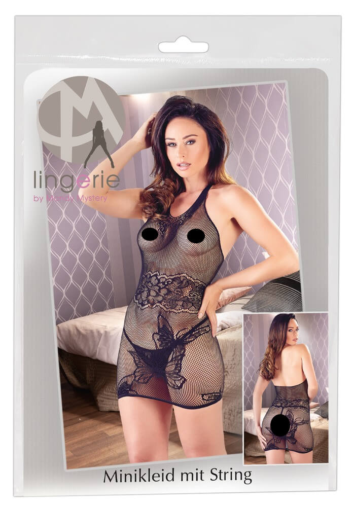 Mandy Mystery - Rochie din plasă cu bretele în jurul gâtului și tanga (negru) Rochie mini confortabilă, din plasă flexibilă, cu inserții și modele fanteziste din dantelă pentru un aspect sexy! Cu tanga asortat! De ce este bună? -material fără cusături pentru confort -margini întărite pentru durabilitate -inserții de dantelă cu model pentru aspect -super... Mai multe informații