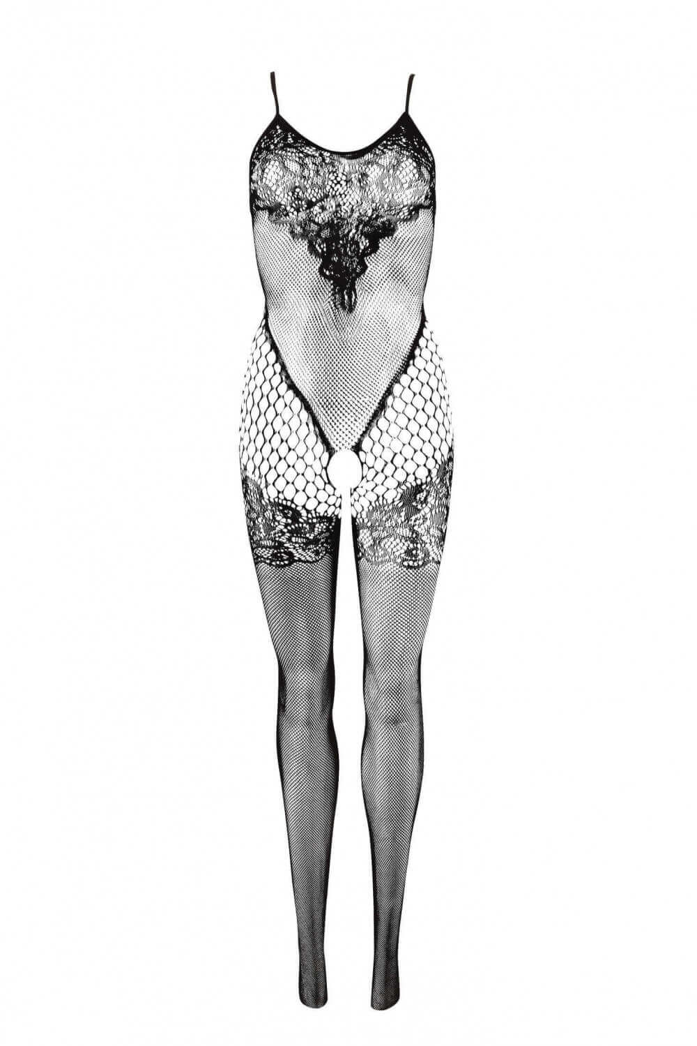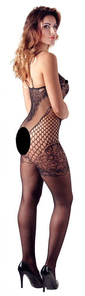 Salopetă elastică, complet transparentă, realizată din plasă dens țesută, model cu efect de dantelă pe piept și coapse, plasă mai subțire cu efect perforat pe laterale. Cu bretele subțiri, elastice și decolteu închis. Deschis la talie. 90% poliamidă, 10% elastan. Culoare negru. Mărime: S-L (uniformă).