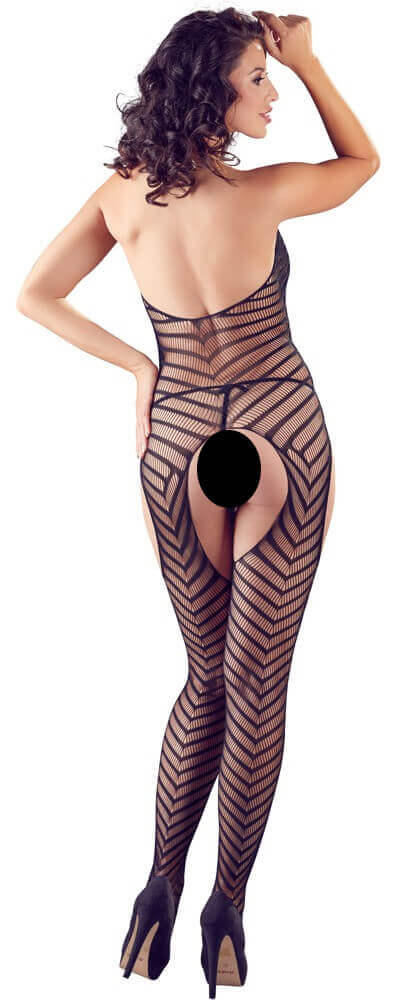 NR: XQSE - curea de gât, în dungi, salopetă deschisă cu tanga - negru (S-L)