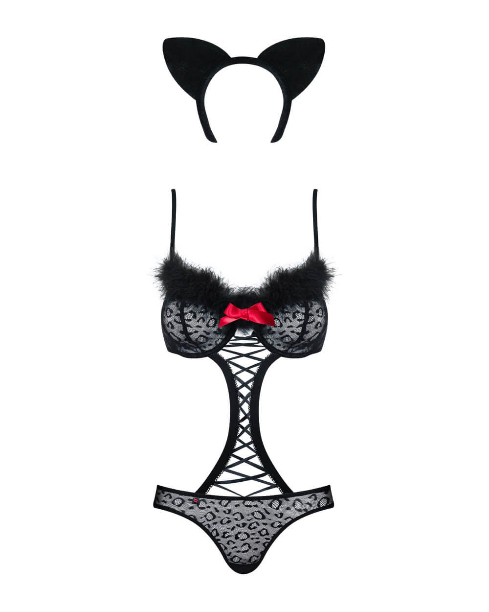 Obsessive Gepardina - costum pisică (negru) Un costum pentru o pisicuta draguta sau o adevarata fiara salbatica! Conținutul trusei: Body de dama cu imprimeu leopard: confectionat din material moale si flexibil sutien cu sârmă cu un decolteu sexy cu un corset din satin la mijloc cu brațe subțiri, reglabile decolteul este înconjurat de o pană foarte... Mai multe informații