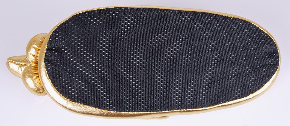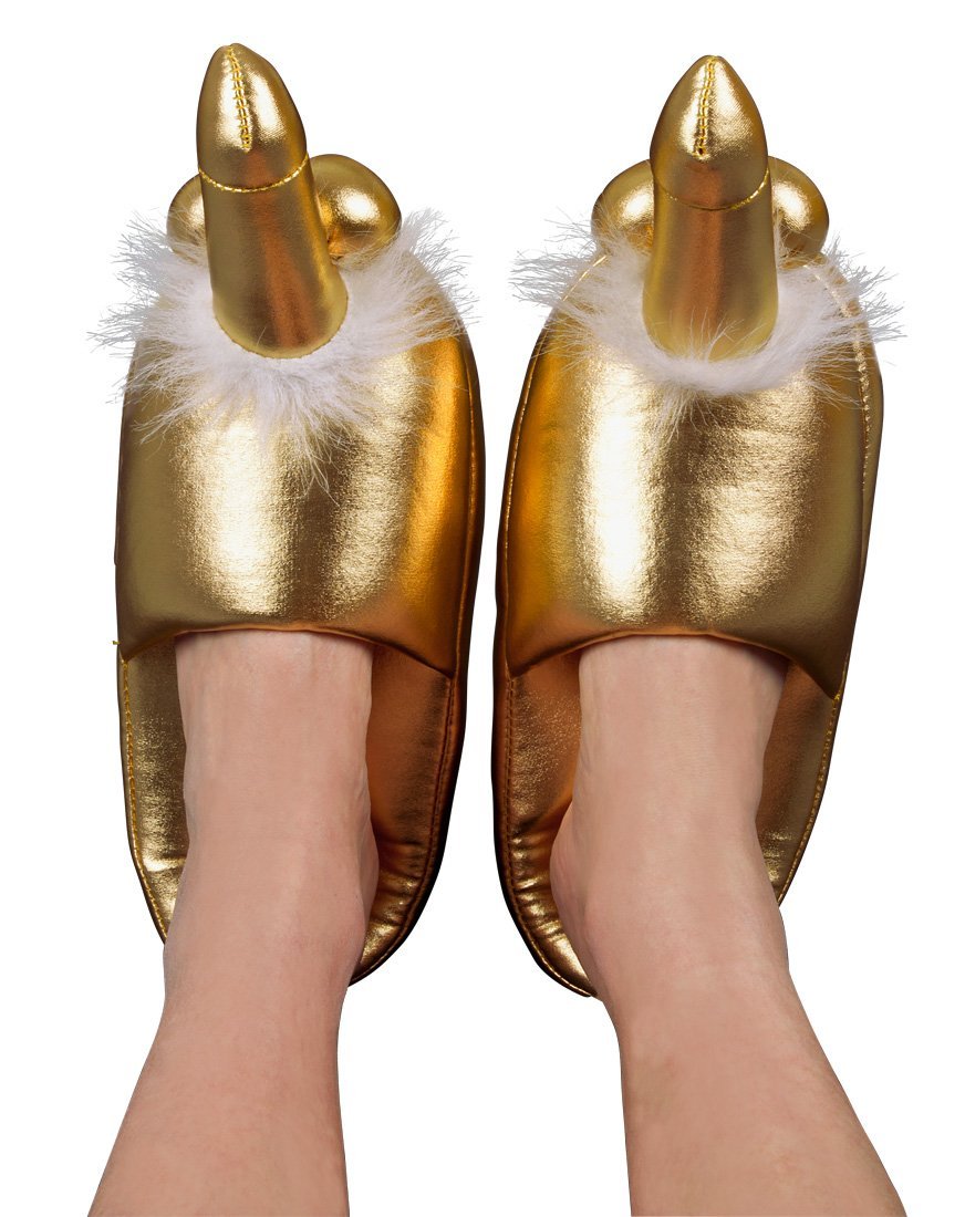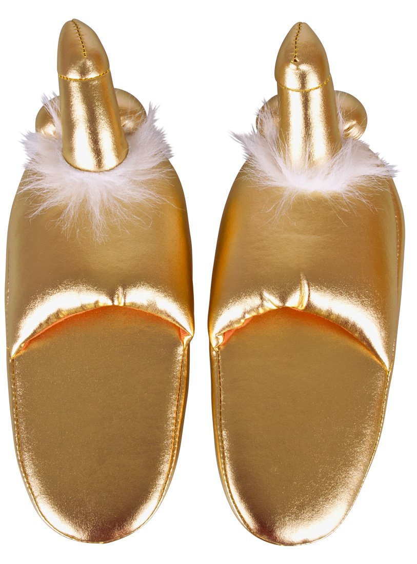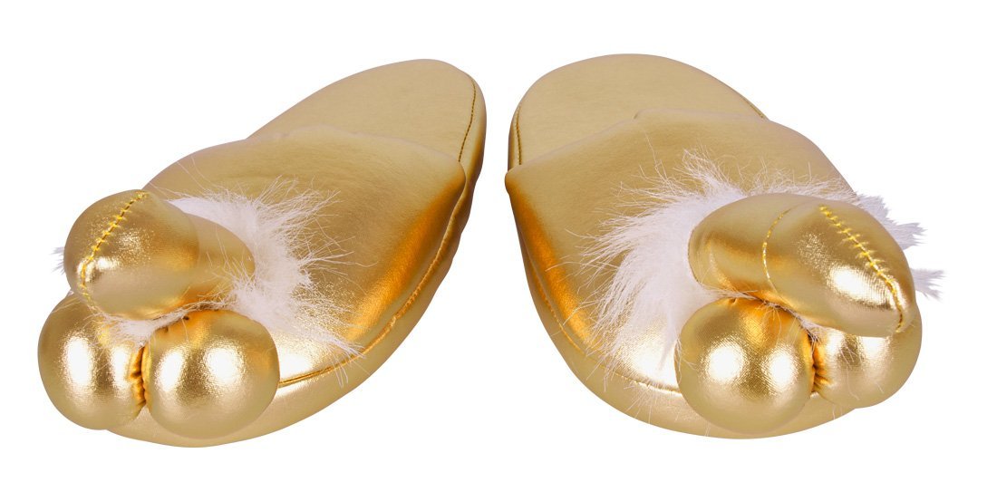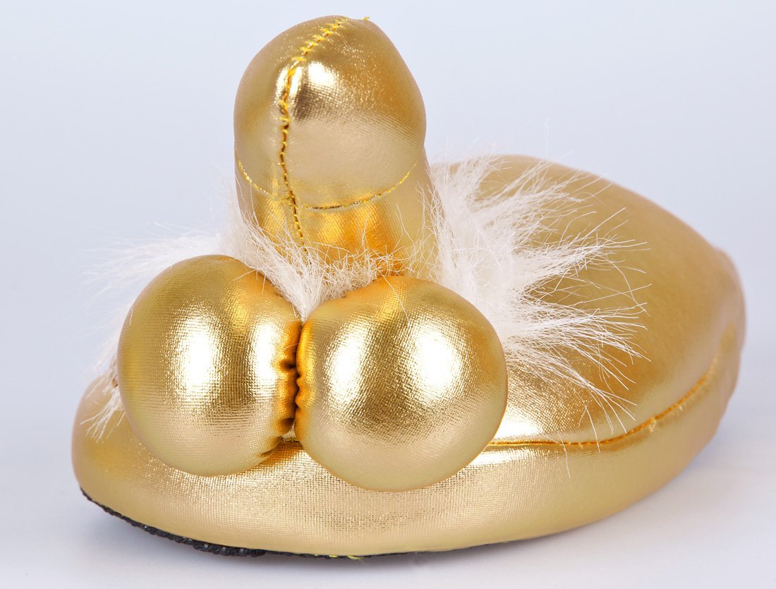 Papucii amuzanți și sexy din pluș moale pentru zilele reci vor crea o atmosferă fierbinte! Papuci din material moale foarte frumos, auriu strălucitor (1 pereche), deasupra lor stă un penis frumos conturat, erect, cu testicule rotunde și păr alb mătăsos. 100% poliester. Dimensiune: mărime uniformă (se potrivește mărimilor 37-43).