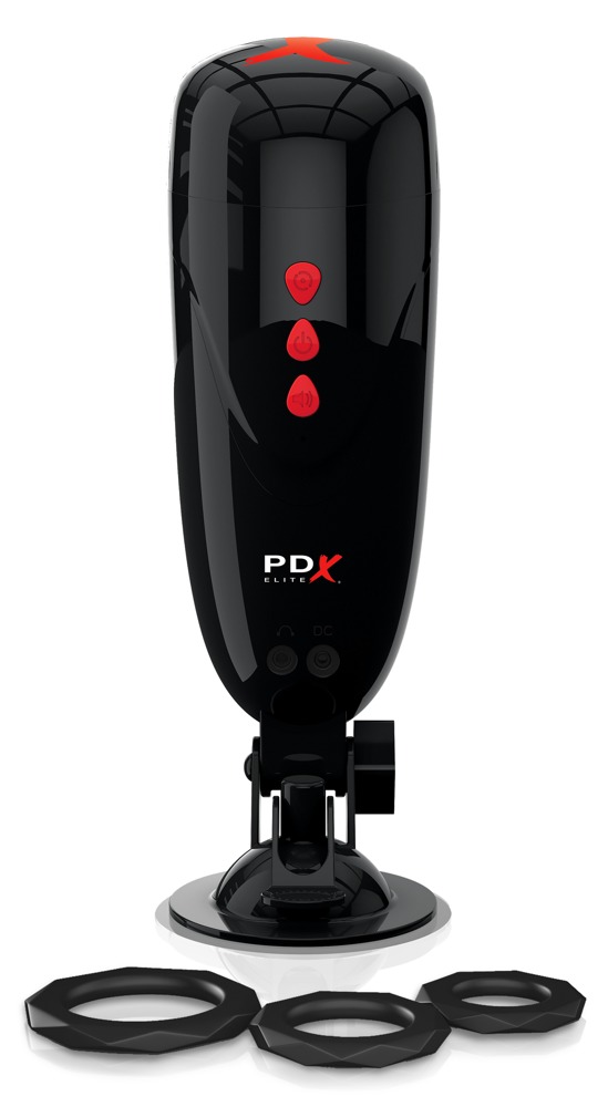 PDX Elite Dirty Talk Starter Stroker – masturbator vibrator cu „dirty talk” și ventuză (negru/culoare pielii)