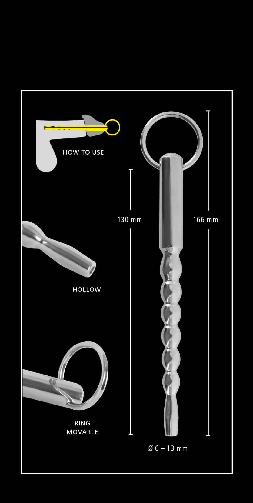 Plăcere extraordinară pentru cei avansați! Dilatator uretral, fabricat din oțel puternic, solid, de calitate extrem de înaltă, gol în interior, cu o suprafață în formă de bilă și cu un inel de prindere pentru o utilizare sigură. Parametrii : Lungime totală: 16,2 cm. Lungime inserabilă: 13 cm. Diametru: 0,6-1,2 cm. Material: Inox: Oțel inoxidabil. Culoare... Mai multe informații