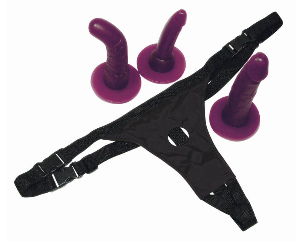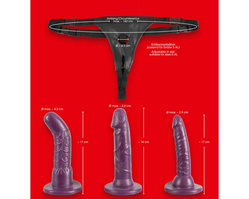 Set de 4 piese mov, reglabil, pentru femei și bărbați (S–XL) Învie momentele intime cu acest set satinat, reglabil, care se potrivește mărimilor de la S la XL. Partea inferioară este ușor căptușită și permite introducerea facilă a unuia dintre cele 3 tipuri de dildo-uri din material neted. Setul conține: Partea inferioară reglabilă (S–XL) Dildo normal... Mai multe informații