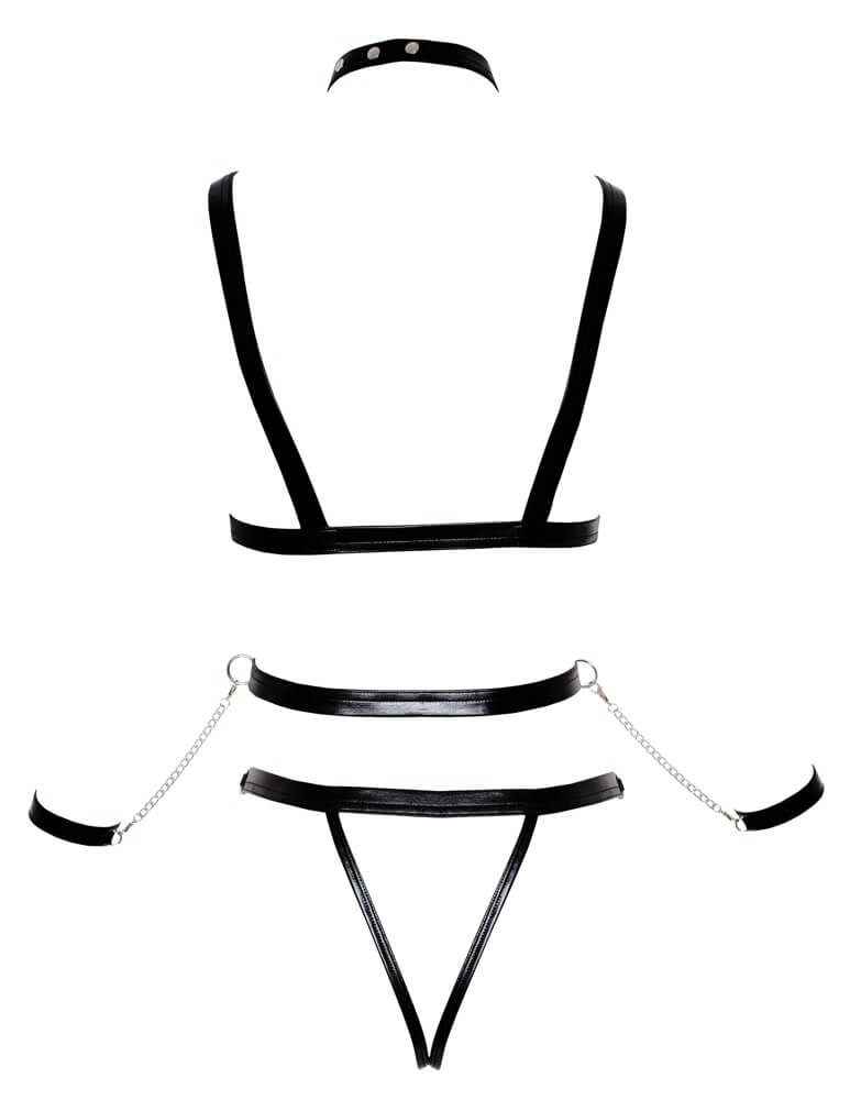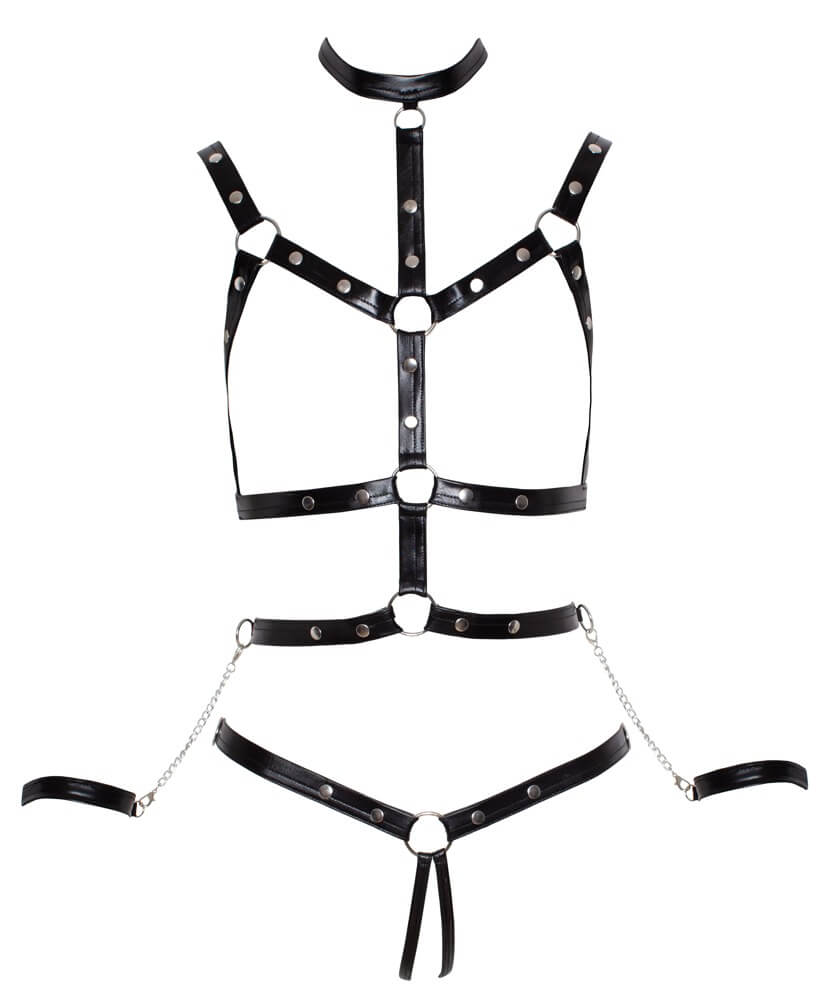 Lenjerie de corp stil complet deschisă din benzi elastice, unde curelele sunt ținute împreună de inele metalice și decorate cu nituri metalice.