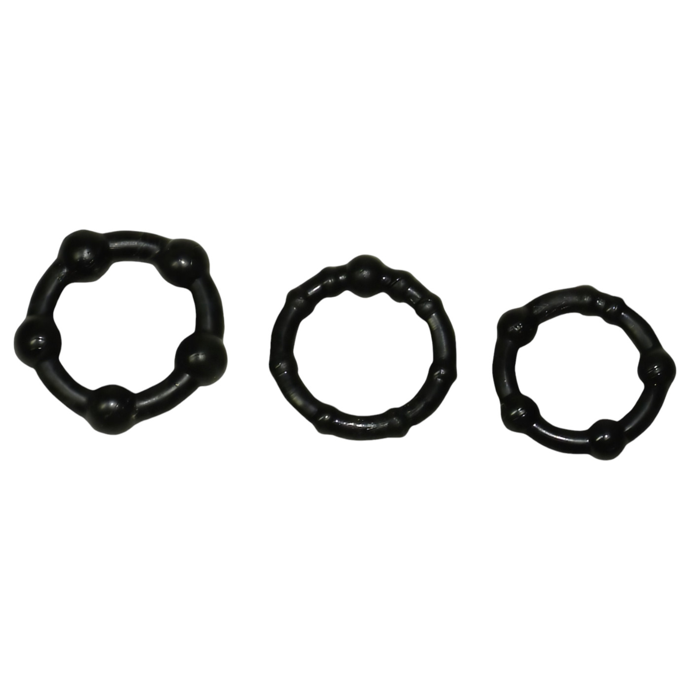 Putere triplă pentru erecții ferme și acte amoroase mai lungi! Un set de 3 bucăți de inele pentru penis, cu diferite suprafețe stimulative pentru bile, pentru a vă răsfăța partenerul cu un plus de plăcere. Inelele pot fi folosite împreună sau separat, chiar și ca inele pentru testicule. Parametrii :Diametrul inelelor: 2 - 2,5 cm (extrem de flexibile).Material: TPE.culoare neagră.