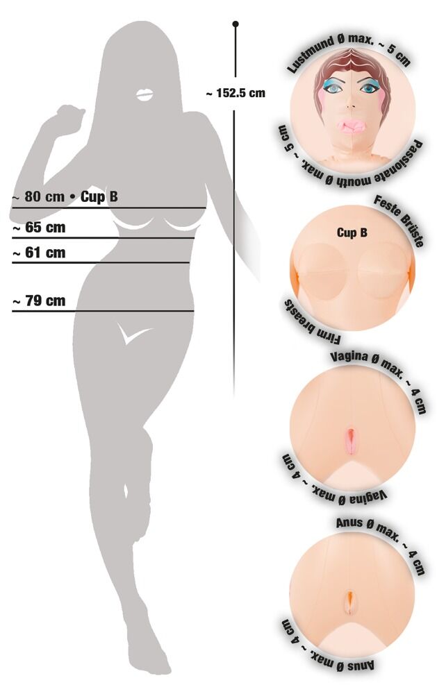 O amantă sexy cu trei găuri senzual de înguste pentru pofta care sunt întotdeauna la dispoziția ta! Păpușă gonflabilă în mărime naturală cu o față fermecătoare desenată și păr castaniu vopsit. Cu trei găuri (gură, vagin, anus). Beneficii : Păpușă sexuală în mărime naturală.Stăpână cu o față imprimată și păr desenat.Cu sâni plini.Stă într-o postură... Mai multe informații