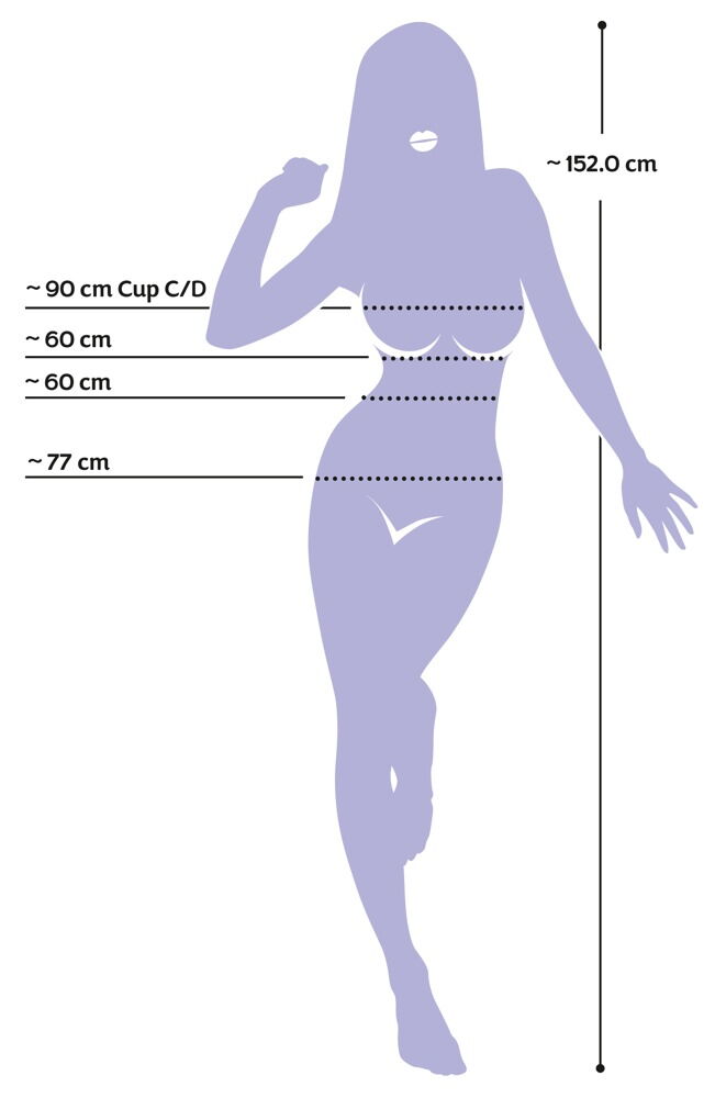 Circumferințe: bust 90 cm, talie 60 cm, șolduri 77 cm